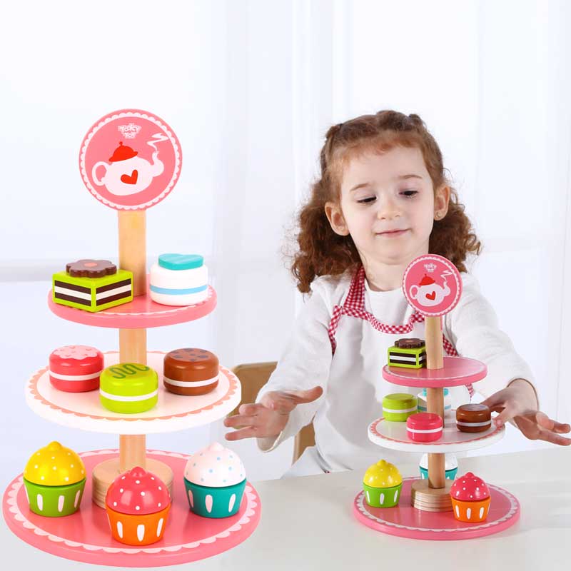 Trä Dessertset för Barn – Leksaksmat Set med Kakfat, Sötsaker, Te-set & Tillbehör, Roligt Träkökstillbehör för Barn