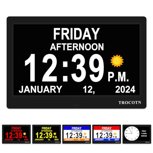 TROCOTN Demensklocka stor digital klocka för seniorer, kalenderklocka stor display med anpassade larm, väggklocka med dag och datum, väckarklocka, skrivbordsklocka (25,4 cm svart)