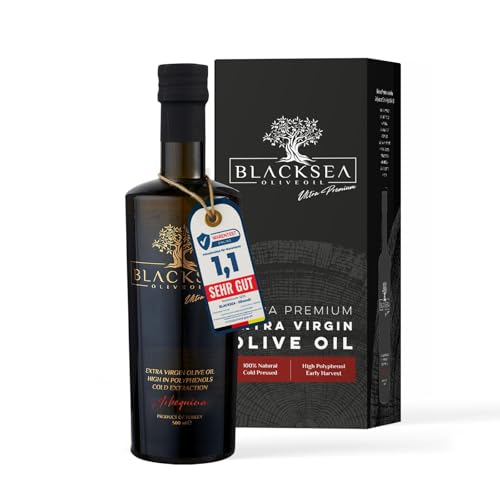 BLACKSEA Olivolja – Prisbelönt Premium Extra Jungfruolivolja (EVOO) – Kallpressad & Filtrerad – Mycket högt polyfenolinnehåll – Arbequina-oliver – Syrainnehåll <0,2% – 500 ml Glasflaska