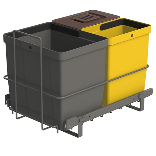 LM 64/3a utdragbar källsortering med 3 kärl (1 x 11 L, 2 x 8 L) i färger antracit, gul, brun+lock – Sopsorteringssystem för köksskåpet – källsorteringsram i antracit 32,8 x 43,3 x 35,4 cm