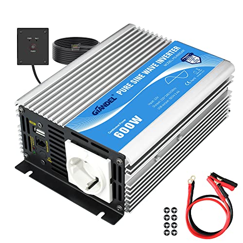 GIANDEL Ren sinus växelriktare 600 W 12 V till 230 V effektomvandlare med fjärrkontroll och USB-port för bärbar dator, kamera, smartphone.
