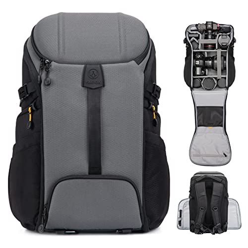 K&F Concept 26,5 L Alpha kameraryggsäck, huvudfack 25 L + toppförlängning 1,5 l, 3 sidoöppning, stor kameraväska med regnskydd, rymmer 2 kamera, 4 linser, 16 tums bärbar dator för fotograf, Grå
