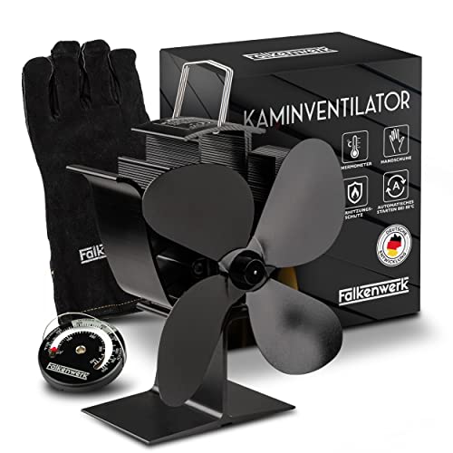 Falkenwerk Ugnsfläkt utan el, tystare kaminfläkt med 4 blad, effektiv och värmedriven fläkt för kamin, ugnsfläkt för värmefördelning + handske och termometer