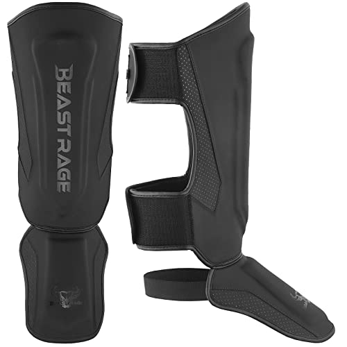 BEAST RAGE skenskydd för kickboxning muay thai, MMA kampsport skenbensskydd, benskydd med vristskydd, MMA-träningsutrustning, sparring träningsutrustning, BJJ Karate Boxning Taekwondo (svart, M)