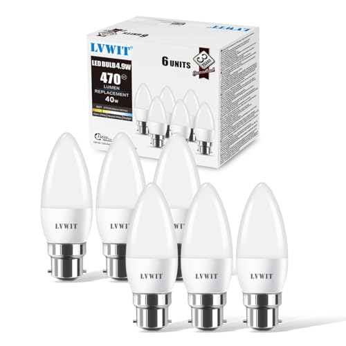 LVWIT B22 LED glödlampa 40 W motsvarande glödlampor, 4,5 W C37 kandelaber bajonett 470 lm, 2700 K varmvita, 200 grader strålvinkel, icke-dimbar (paket med 6)