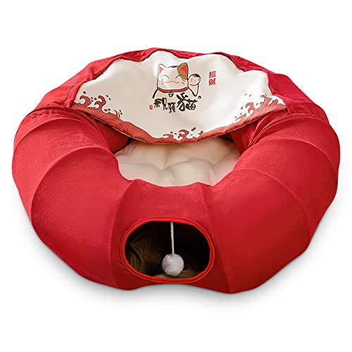 ALLSOPETS Cats Tunnel Bed 2 i 1 Rund hopfällbar Cat Tunnel Leksak Kattsäng med 1 hängande repbollar Inomhus Cat Tunnel för katt Kattungar Kanin marsvin Röd