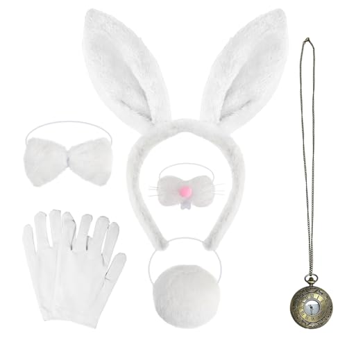 SAIIURV 6 delar barn vuxen vit kanin kostym set, kaninöron och svans, näsa, fluga, handskar, klocka, vit kanin kostym maskeraddräkt för påsk karneval halloweenfest (6 st)