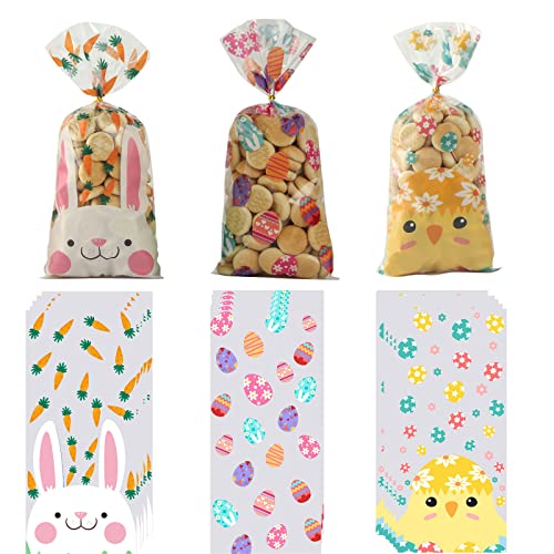 mciskin Påsk cellofan presentpåsar, plastbehandlingspåsar med vridband för glad påsk, färgglada inslagning presentpåsar för godis, söta ägg kanin kyckling morot godispåsar för påskfest dekorationer