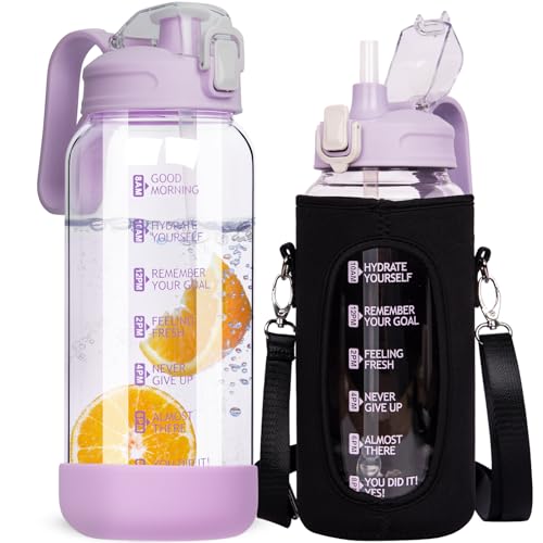 DEARRAY 2 liter glasvattenflaska med sugrör och tidsmärkningar 2 l stor läckagesäker motiverande glas dricksflaska stor glaskanna med lock bpa-fri glaskaraff