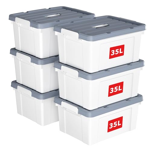 Cetomo 35 L x 6 förvaringslådor, plastförvaringslåda med lock, organiseringsbehållare med handtag och säkra spärrspännen, stapelbar, kapabel, tygkorg för hemmakontor, 35 L-6 pack, vit