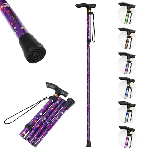 supregear Hopfällbar Käpp, 5 Nivåer Justerbar Höjd Gående Pinne Lätt bärbar Käpp Resekäpp med Handledsrem och T handtag för äldre Funktionshindrade Män Kvinnor, Lila Floral