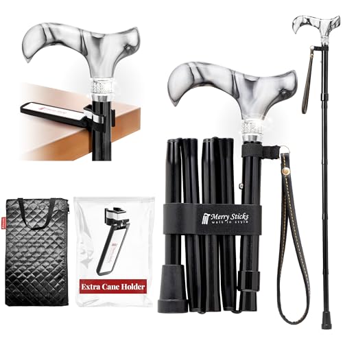 Merry Sticks hopfällbara och justerbara promenadkäpp, Hopfällbar käpp, Vikbar käpp, Royal Blackmed europeiska kristaller, En praktiskt väska för promenadkäpp en Merry Sticks smarta reflekterande käpphållare ingår
