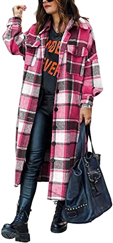 Asksa Rutig lång skjortjacka för kvinnor, blus, fickor, knappar, långärmad, stor storlek, kappa, jacka, skogsarbetare, jacka, mode, pojkvän, shacket, jackor, En rosenröd, XXL
