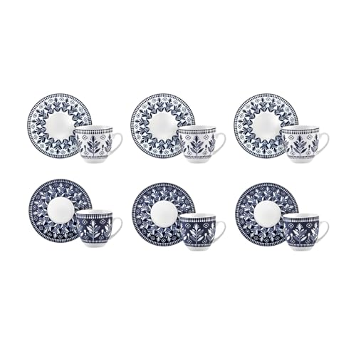 Karaca Beylerbeyi porslin turkisk kaffekopp set med 6, 12 stycken, 80 ml, vit blå multi