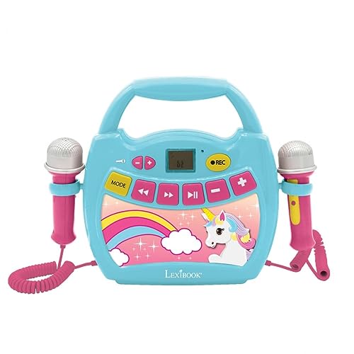 Lexibook Enhörning, Min första digitala karaoke-spelare med två leksaksmikrofoner, trådlösa funktioner, inspelning och röstväxlare, blå/rosa, MP300UNIZ