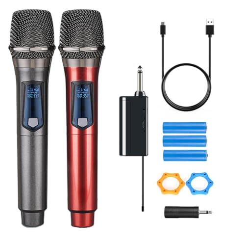 HUACAM Trådlösa mikrofoner, dubbel handhållen dynamisk trådlös mikrofon för karaoke, bröllop, DJ, fest, tal, kyrka, klass, PA-system, 20 fot, grå och röd