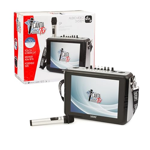 Canta Tu 2024 bärbar karaoke trådlös bärbar karaoke med trådlös mikrofon, axelrem, stor pekskärm, wifi-anslutning, rösteffekter, uppladdningsbart batteri, röstväxlare, silver