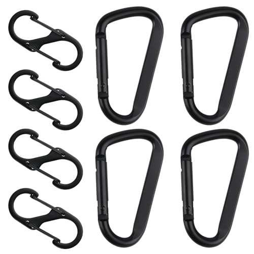 8 st karbinhakar set, inklusive 4 st D-klämmor karbinhakar och 4 st. S-karbinhakar aluminium, metall dubbel karbinhake, karbinhakar svart för camping vandring ryggsäck