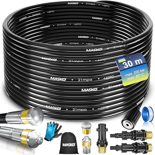 MASKO® Rörrengöringsslang, set, avloppsrensare, 30 m, 200 bar, inkl. påse, 3 adaptrar, 2 munstycken, roterande, kompatibel med Kärcher k2–k7-serien, Lavor-högtryckstvätt, universalt rörrengöringsset