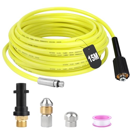 SWAWIS Rör rengöringsslang 15 m 180 bar 60 °C rörrengöringsset dräneringsslang med munstycken styv + roterande, adapter för Kärcher K2-K7 högtryckstvätt, gul