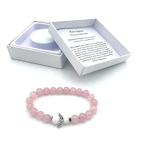 Handgjorda rosenkvarts ädelsten armband med skyddsängel i presentförpackning | lycka kärlek energi familj