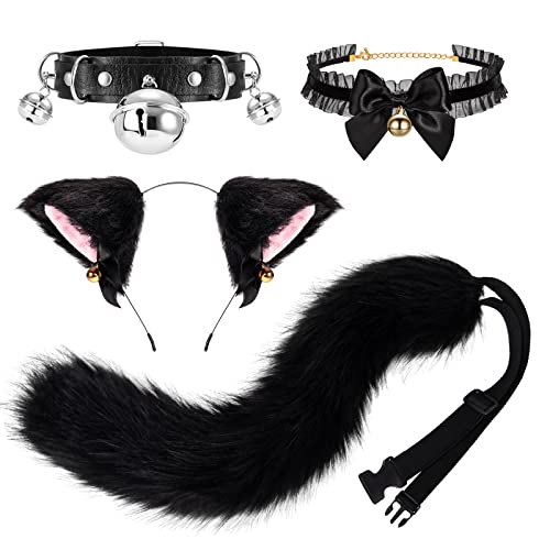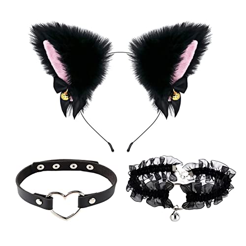 TSHAOUN Djurkostym katt cosplay kostymset, kattöron pannband med klockor halsband, för anime fin klänning fest halloween jul utklädning karneval rollspel. Svart: