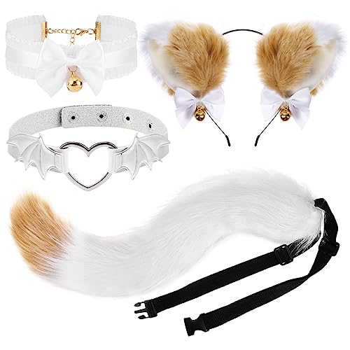 XEPST Katt cosplay kostymset kattöron och djursvans kit, fuskpäls lurvig räv varg svans kit med öron och klockor krage för anime fin klänning fest halloween jul utklädning karneval rollspel