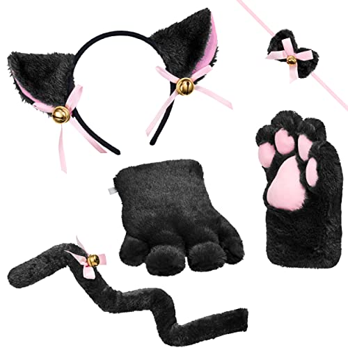 Balinco kattdräktset, kattöron hårband + plysch tassar + fluga + kattsvans, djurklänning, anime, cosplay fest, halloween, karneval (svart)