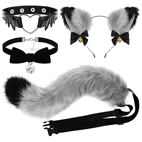 XEPST Katt cosplay kostymset kattöron och djursvansats, fuskpäls lurvig räv varg svans kit med öron och klockor choker för anime fin klänning fest halloween utklädning karneval rollspel