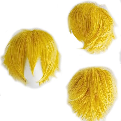 Anime Cosplay Peruk - Gul Kort Vågig Slät Syntetisk Peruk för Halloween, Karneval, Kostym Party - Med Gratis Mössa för Kvinnor Män