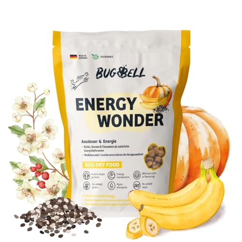 BugBell 800 g High Energy torrfoder för hundar, insektprotein utan spannmål, banan & pumpa & chia & laxolja och L-karnitin stöder ett aktivt hundliv, 100% transparent deklaration