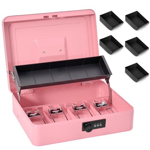 Sgorlds Stor låst kassaskrin med kombinationslås och sedelfack, sparbössa med kassaskåp, låssäker låda för kontorsföretag, 30 cm x 24 cm x 8,9 cm, rosa