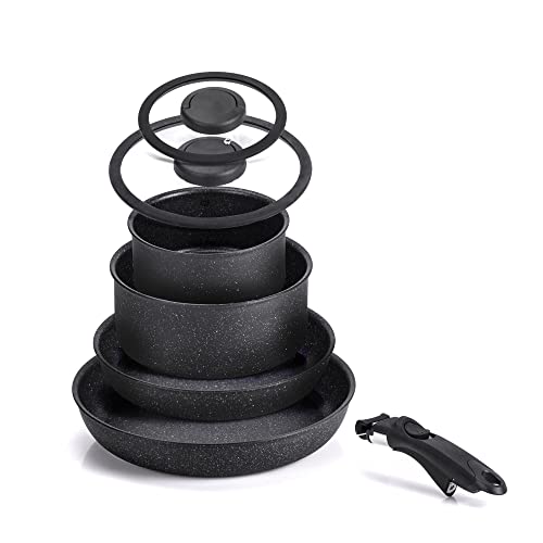 BOREINE Kastrullset, Non stick kastrull set, kastrullset induktion, kastruller och stekpannor, Kökssats, med avtagbart handtag, Non-stick pan set, Ugnssäker (Svart, 14st)