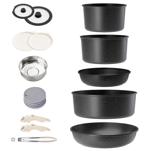 RIOVARM Induktion kastruller och stekpannor set med avtagbara handtag, non-stick granit, stapelbara köksredskap set med silikonlock, platsbesparande kastrull- och stekpannor utan PFOA, stekpanna,