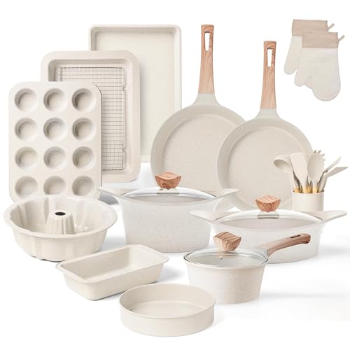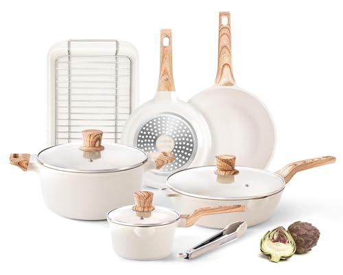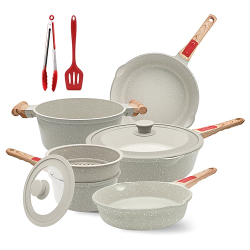 RIOVARM Induktion kastruller och stekpannor, non-stick beläggning, granitköksredskap set med lock, PFOA-fritt köksredskapsset med träkornhandtag, stekpanna, kastrull, bakform