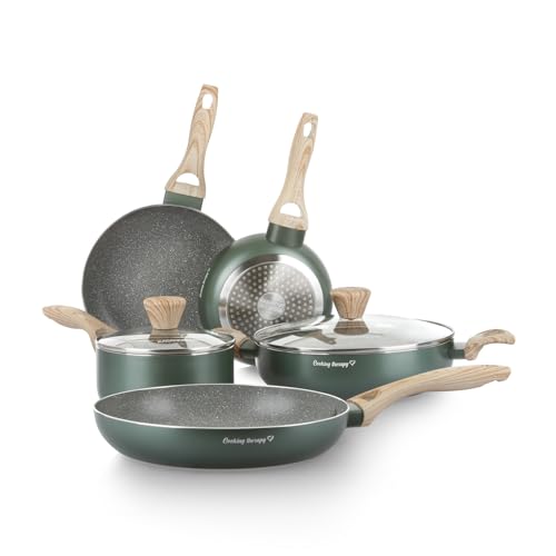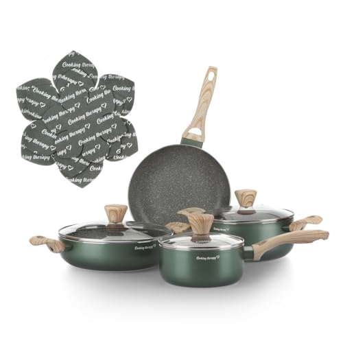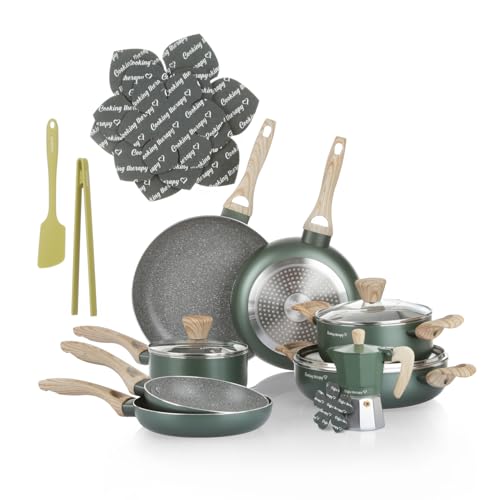 RIOVARM Induktion kastruller och stekpannor, non-stick beläggning, granitköksredskap set med lock, PFOA-fritt köksredskapsset med träkornhandtag, stekpanna, kastrull, bakform