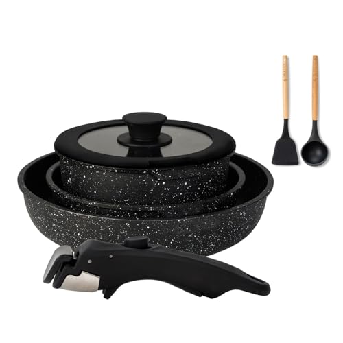 RIOVARM Induktion kastruller och stekpannor set med avtagbara handtag, non-stick granit, stapelbara köksredskap set med silikonlock, platsbesparande kastrull- och stekpannor utan PFOA, stekpanna,