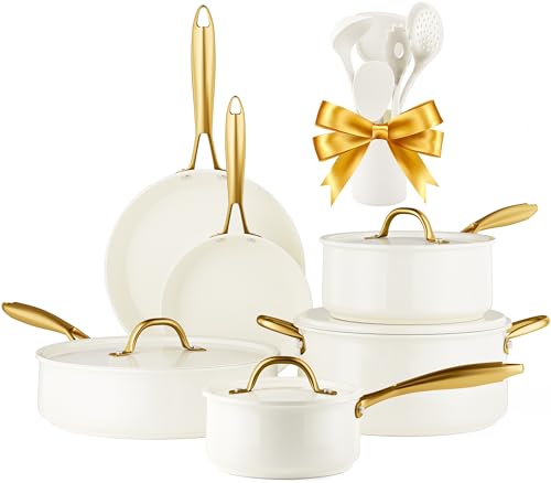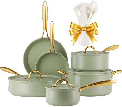 RIOVARM Induktion kastruller och stekpannor set med lock, keramisk non-stick beläggning köksredskap set, köksredskap väsentliga set med köksredskapsset, stekpanna, kastrull, sauteus, såspanna spatel