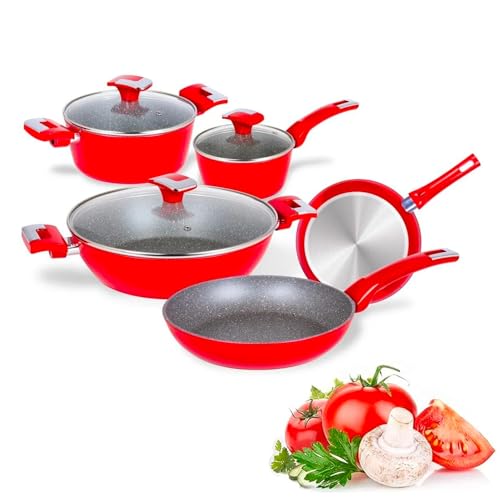 Tognana Rustic Stone, Batteri med kastruller och stekpannor, set med 2 stekpannor, 3 grytor, 3 genomskinliga lock, 8 stycken, aluminium, röd
