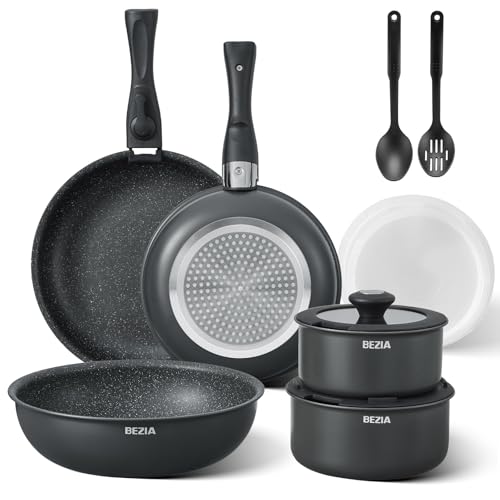 BEZIA Pannset med avtagbara handtag, kastruller och stekpannor, set med hälsosam keramisk beläggning, induktionshällar, set med 17 delar