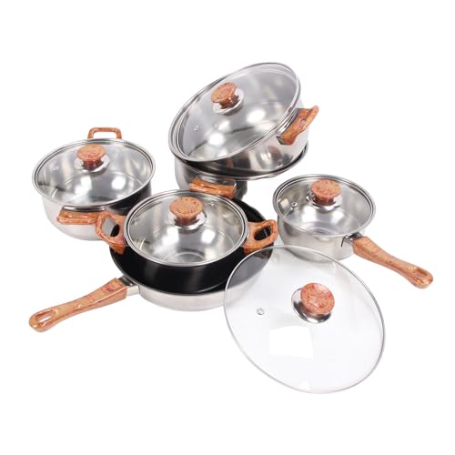 Aramox Kastruller och Stekpannor Set Kokkärlsset Rostfria Kastruller och Stekpannor Träådringshandtag för Matlagning Stekning Kokning Av Soppa