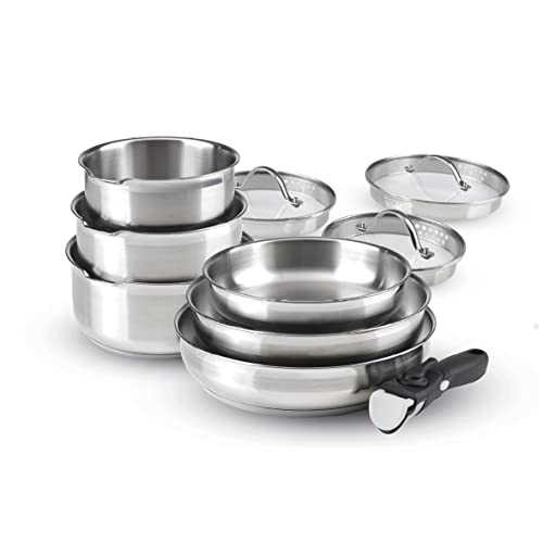Qulinart by Brandt - Induktionsköksredskap 10 stycken - set med 3 kastruller, 3 stekpannor och 3 durklock med avtagbart handtag - rostfritt stål - set för all eld - silver