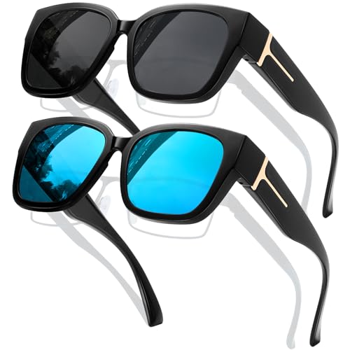 KANASTAL Spegelblå 2-Pack Polariserade Solglasögon Över Glasögon Dam Kat 3 Stora Överdrag Solglasögon Herr Blue Fit Over Sunglasses Women Men Polarized UV400 Fiske Körning - Svart och Blått