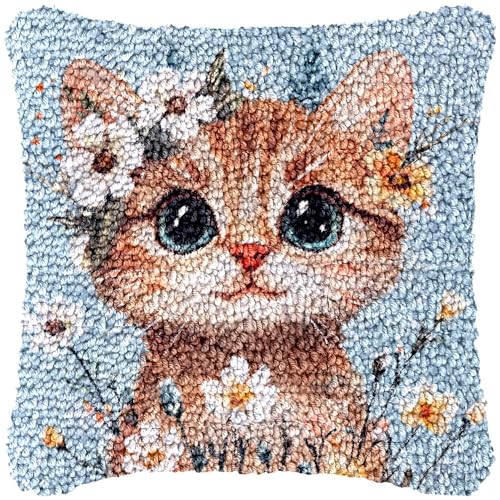 Katt- och blommor spärrkrok kit kudde för vuxna kastkudde förtryckta mönster örngott handarbete virkade garn spärr krok kudde för heminredning 43 x 43 cm (17 x 17 tum)