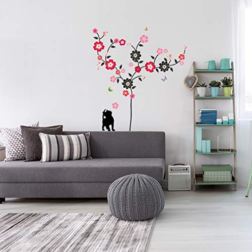 Ambiance-Live väggtatuering träd i blomma, katt och fjärilar väggdekal