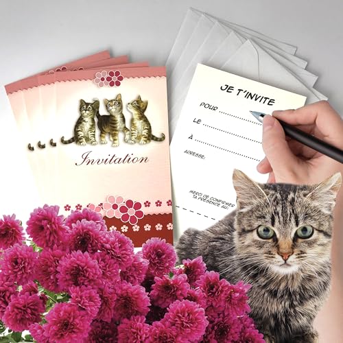 Set med 5 inbjudningskort katt kattungar djur med 5 vita kuvert 9 x 14 cm - text jag bjuder in dig till... den (datum) till (tid) adress - fest, mellanmål, födelsedag, rosa blommor för flickor -