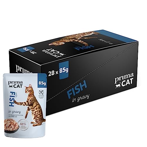PrimaCat – klassisk komplett katt våt mat, fisk i steksås kattmat, förpackning med 28 85 g vardera