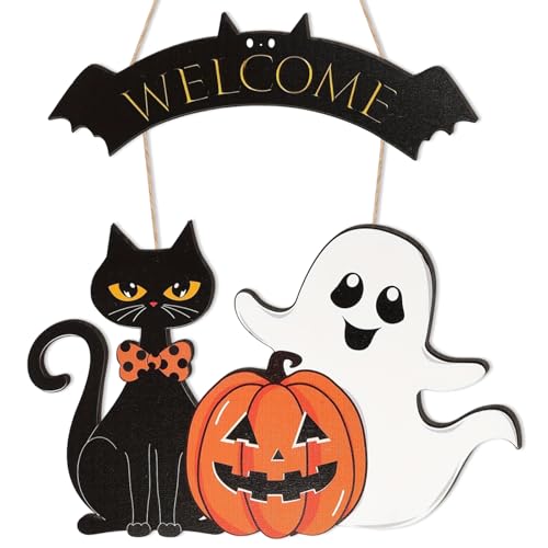 Halloween dörrskylt att hänga upp, halloween trä ytterdörr dekoration, läskig pumpa, spöke, svart katt, halloween välkomstskylt dekoration, för hem, halloweenfest, utomhusdekoration