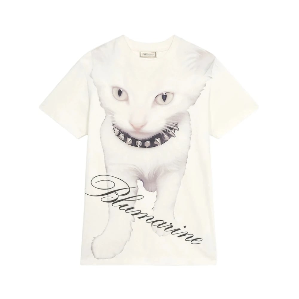 Blumarine, Toppar , Dam, S, Vit Katt Logo T-shirt Korta ärmar