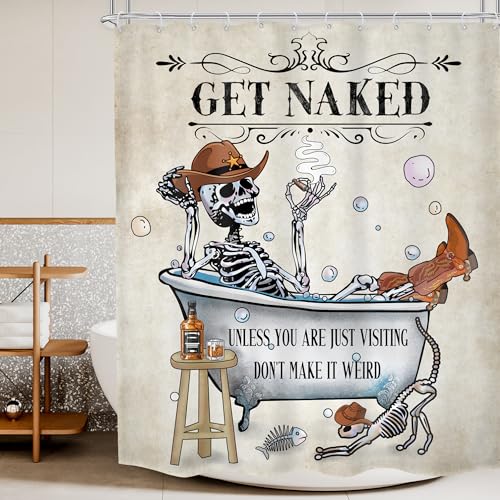 Mitpok Western cowboy duschdraperi 60 B x 72H roligt skelett skalle retro väst vintage rolig gotisk cool badrumsdekor katt fisk bubblor läskig grädde baddraperi tyg polyester 12-pack krokar